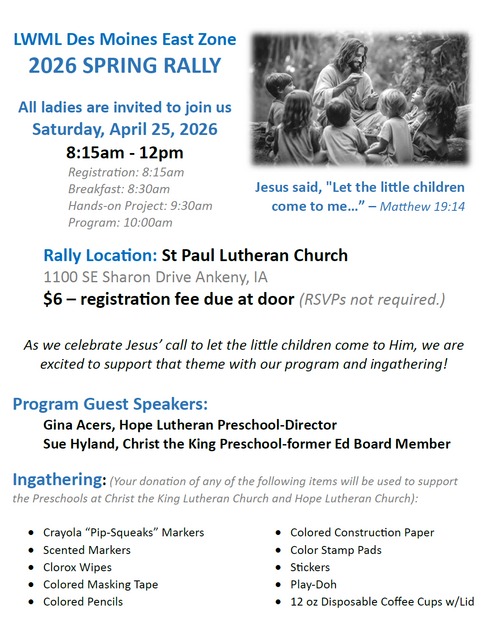 Check back here for events happening at St. Paul, LWML East Zone and our National LWML.